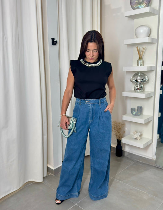 Rhinestone Embroidered Neck Top